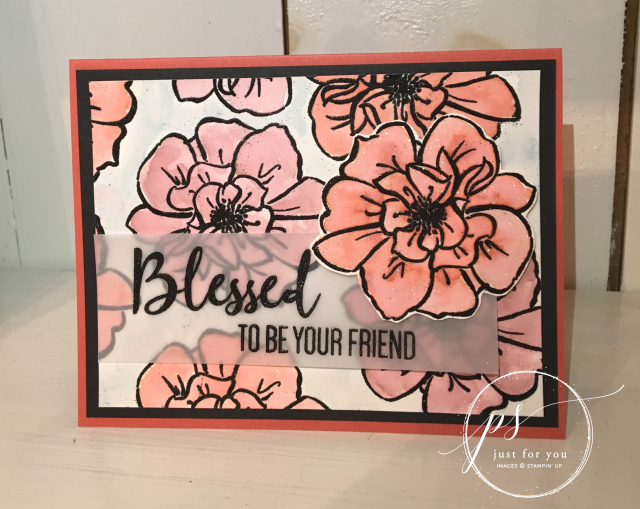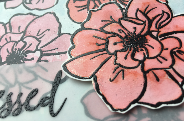 Watercolouring is fun to do on Shimmery White cardstock! For this card, I used black embossing powder and then watercoloured with 3 different ink colours and an Aquapainter. I heat embossed on Vellum cardstock with Black Embossing powder and I love how you can still see the pattern through after your add the greeting and add the layer to the card!