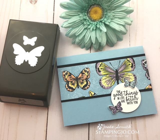- Stamp small butterfly on to Whisper White scrap cardstock and punch out using matching punch. Stamp the body of the butterfly.