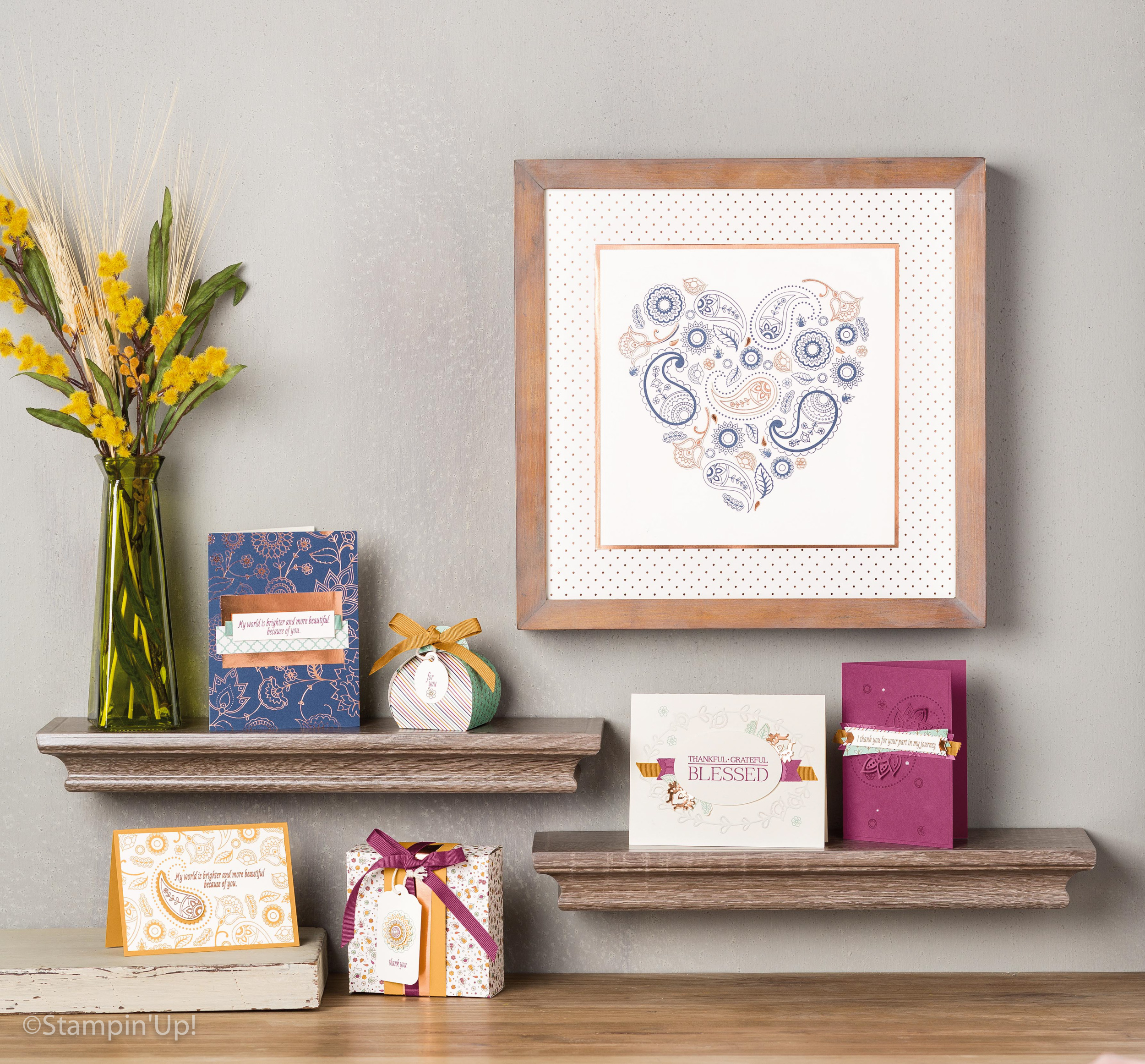 Check out all the coordinating products: Paisleys Framelits Dies (141849), Petals & Paisleys Designer Series Paper (142017), Petals & Paisleys Cardstock Pack (142018), 3/8" Ribbon Trio Pack (142021), Pretty Paisleys Textured Impressions Embossing Folder (141833), Copper Foil Sheets (142020)