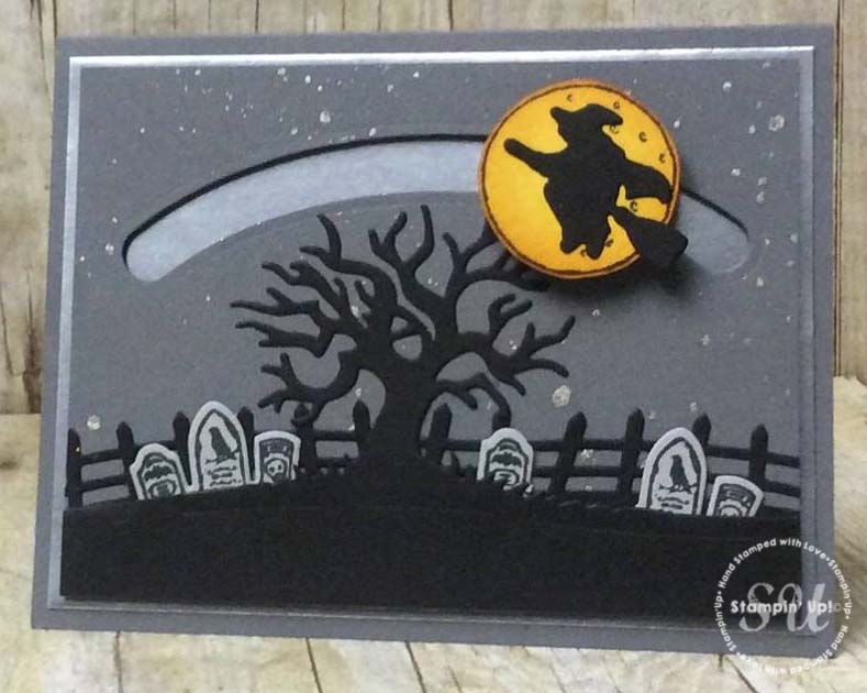 Sliding Star Framelits (141820); Halloween Scenes Edgelits (141842); Clear Wink of Stella Glitter Brush (141897); Stamping Sponges (141337); Paper Snips (103579); Stampin’ Dimensionals (104430); SNAIL adhesive (104332); 2 Pennies or Washers